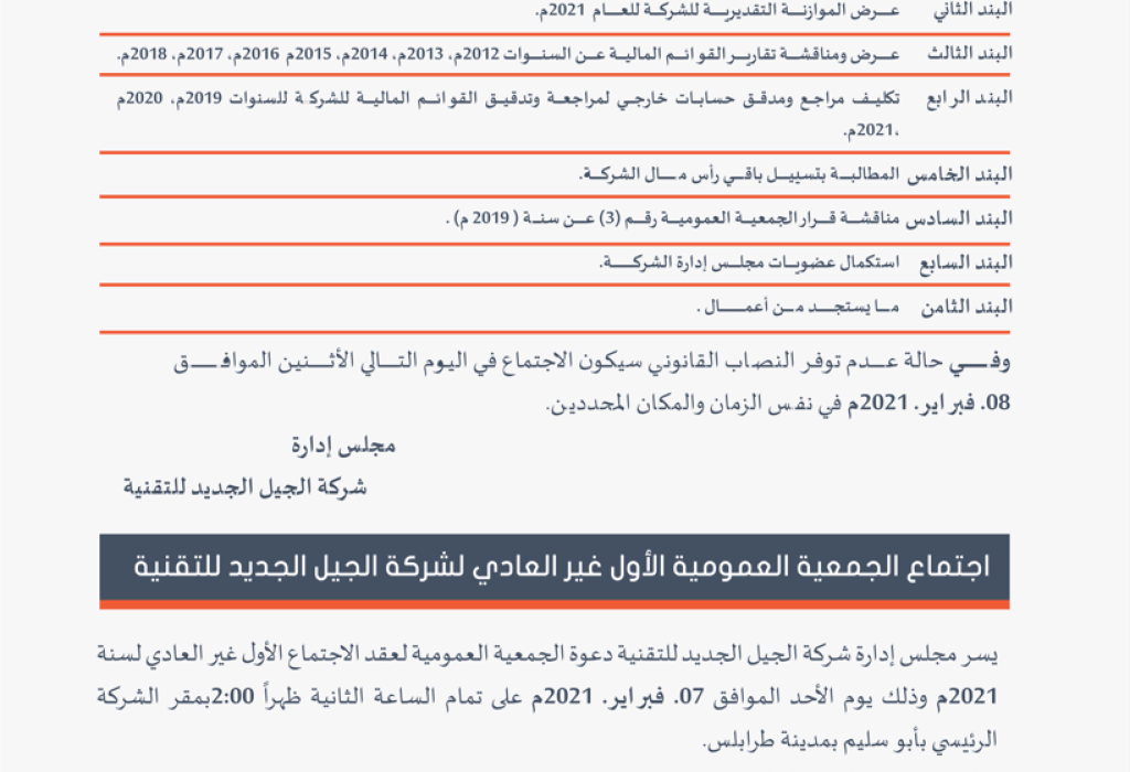 دعوة لإجتماع الجمعية العمومية لشركة الجيل الجديد للتقنية 2021