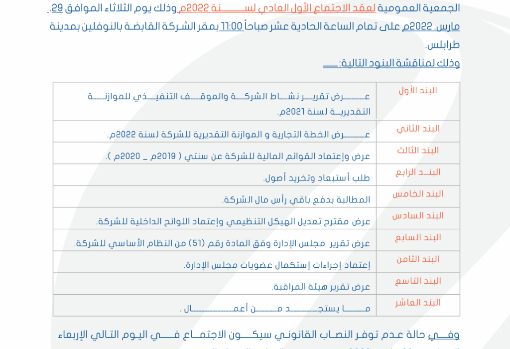 دعوة الجمعية العمومية لعقد الاجتماع الأول الغير العادي لسنة 2022م