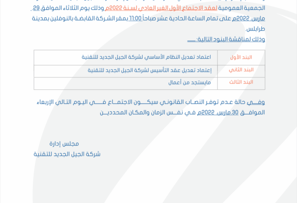 دعوة لإجتماع الجمعية العمومية لشركة الجيل الجديد للتقنية 2021